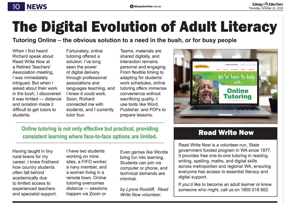 During Get Online Week, Lynneās experience and story onĀ adult online tutoringĀ was featured in theĀ Albany AdvertiserĀ on Thursday, October 23, highlighting how online tutoring is helping learners across WA.